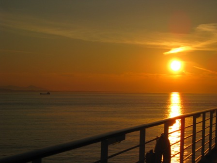 Below- photo of my feet (thought it was cute) as we sail out of Seattle, then my husband and I as we sail from Seattle and then Sunset later that evening...
